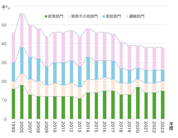 | 年度 | 合計 | 産業部門 | 業務その他部門 | 家庭部門 | 運輸部門 | 廃棄物分野 |