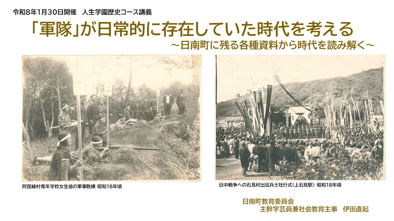 日南町内には、戦争に関する物的証拠や古文書、古写真が地域にたくさん残っています。そこから読み取れる戦争の歴史を解説します。講師は、歴史学の観点から「戦争」について調査・研究をしている日南町教育委員会事務局 伊田主幹学芸員です。
