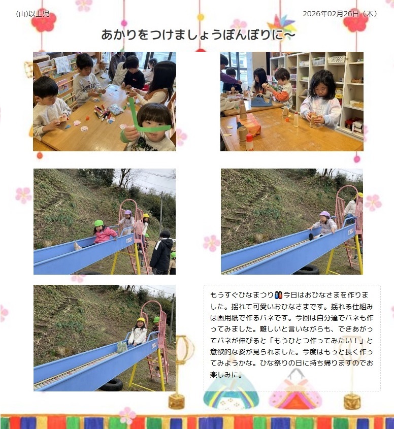 | 施設概要 | 木造平屋建 185平方メートル(平成15年4月建築)園庭 150平方メートル |