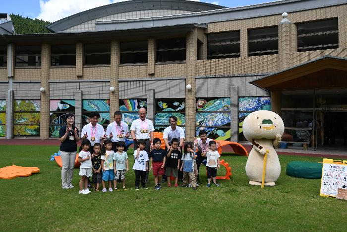 令和7年9月17日(水曜日)には、認定こども園にちなん十色のうさぎ組の園児11名が参加し、お披露目会が行われ、本事業に対して企業版ふるさと納税をいただいた株式会社テレプラザ様に対して、園児からお礼のメダルが渡されました。