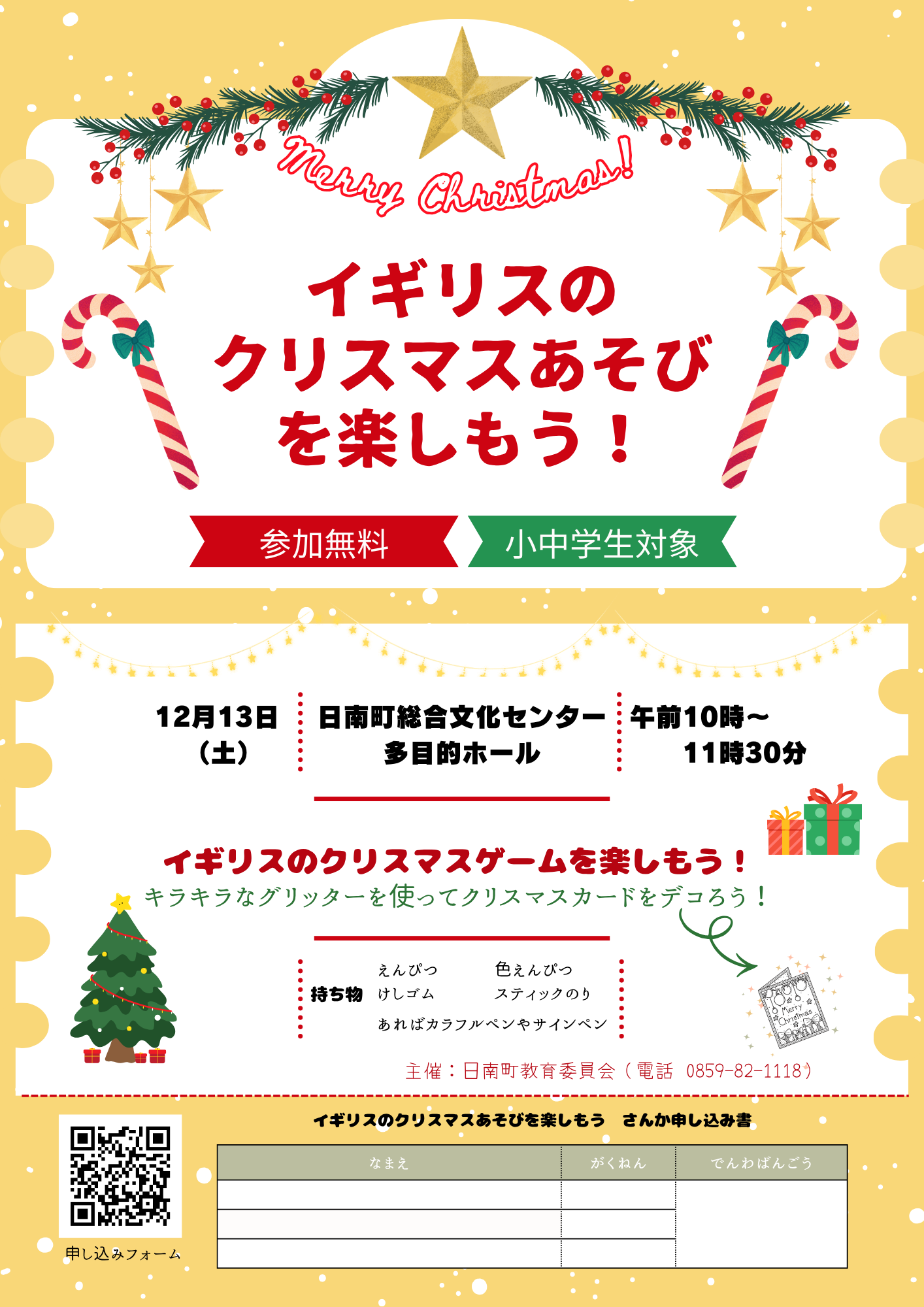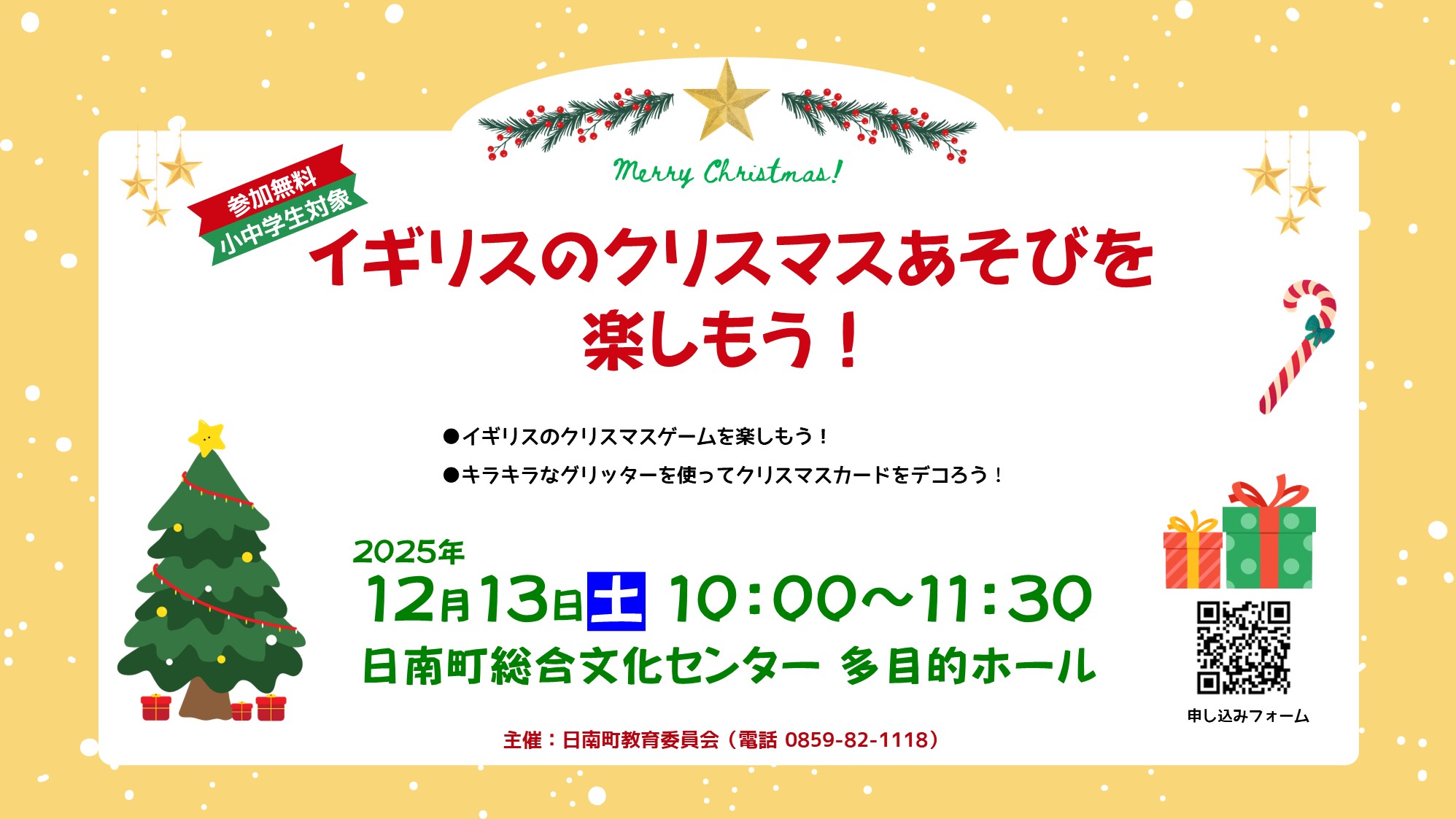 【12月13日開催】イギリスのクリスマスあそびを楽しもう(国際理解講座 兼 日南町生涯学習講座)