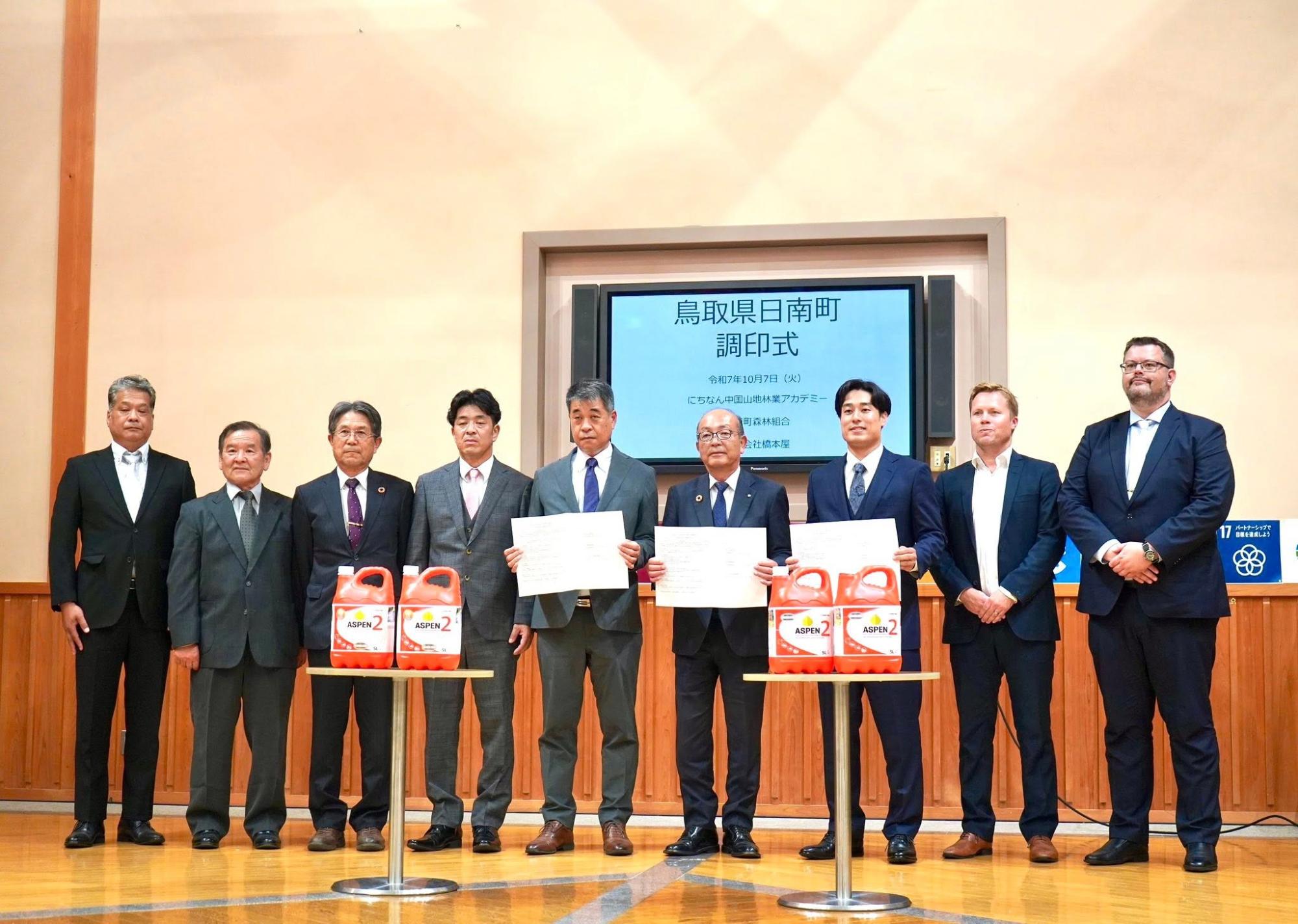 令和7年10月7日、日南町役場において、株式会社橋本屋(東京都文京区)、日南町森林組合、にちなん中国山地林業アカデミーの三者による「ASPEN(混合燃料)の普及を通じた林業の労働環境の改善に関する連携協定」の調印式を行いました。