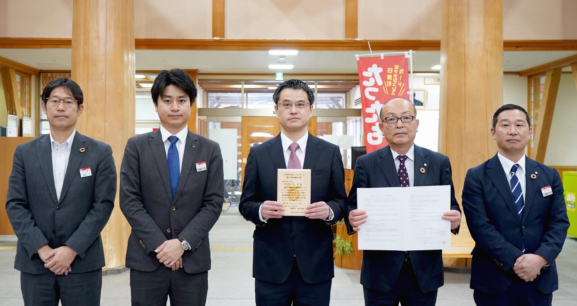 調印式では、日南町長 中村 英明 より、日南町産材で製作した認定証をお渡しいたしました。